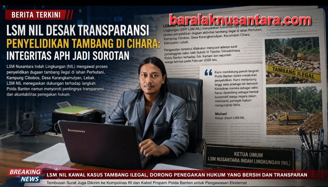 LEBAK, baralaknusantara.com – Dewan Pimpinan Pusat Nusantara Indah Lingkungan (DPP LSM NIL) menyatakan komitmennya untuk mengawal proses penyelidikan dugaan aktivitas tambang ilegal di lahan Perhutani, Kampung Cibobos, Desa Karangkamulyan, Kecamatan Cihara, Kabupaten Lebak.
